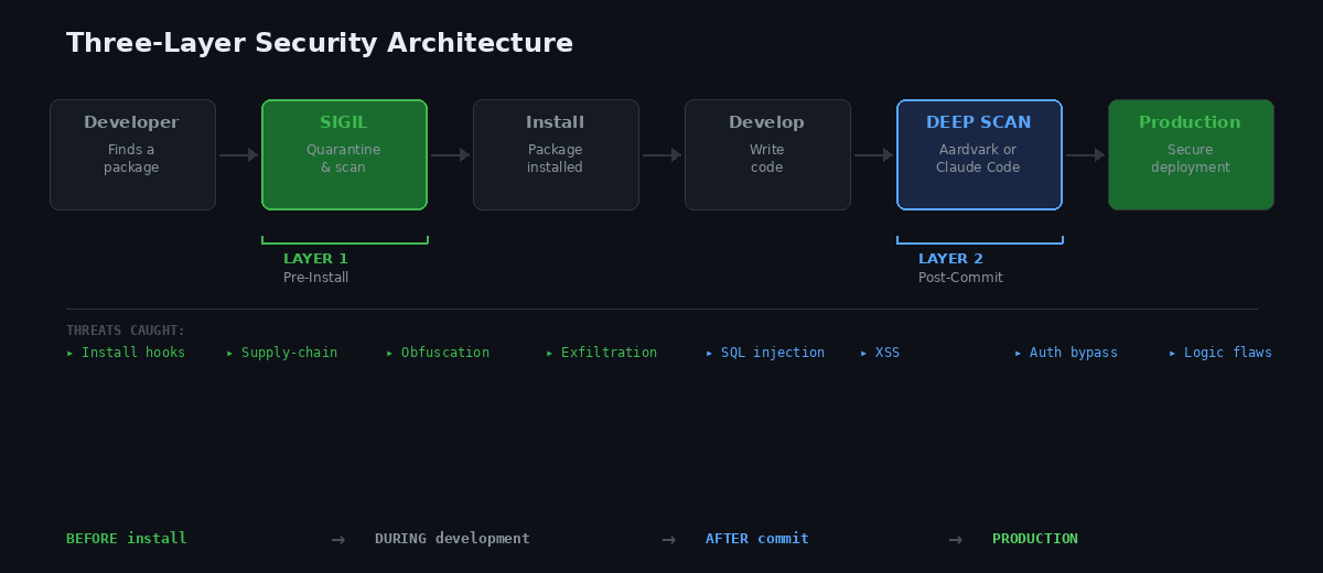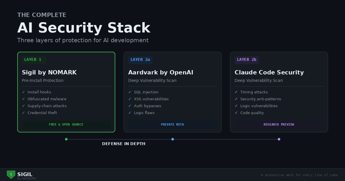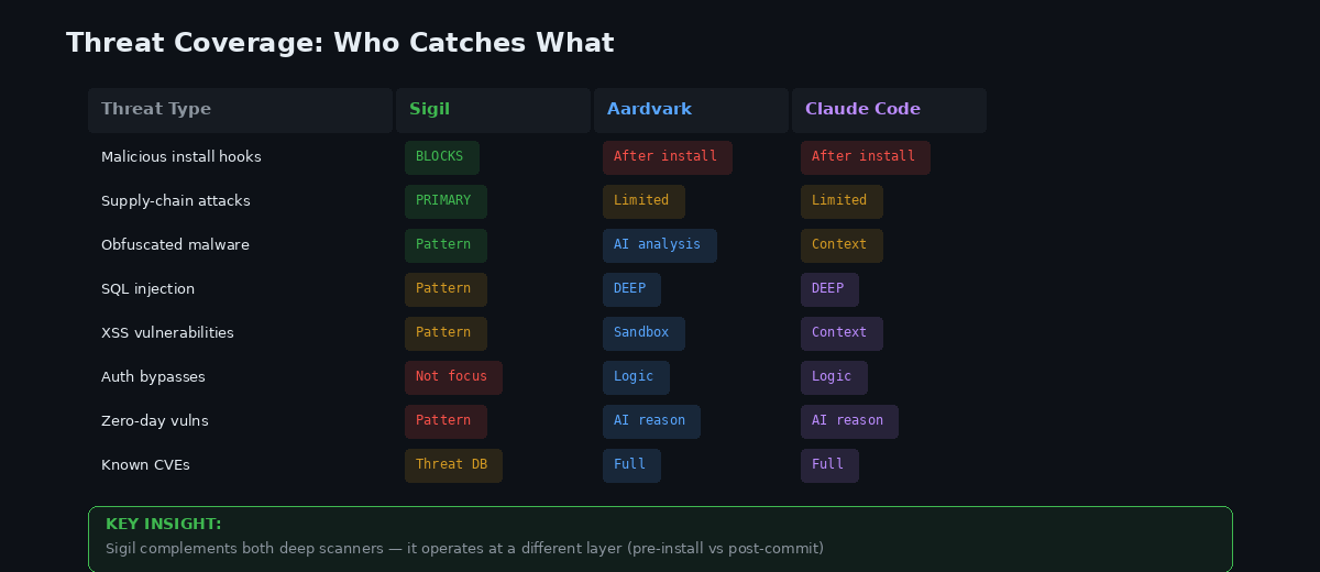 The key insight: Aardvark and Claude Code Security compete with each other (both do deep vulnerability scanning), but Sigil complements both because it operates at a completely different layer—before code is installed rather than after.
