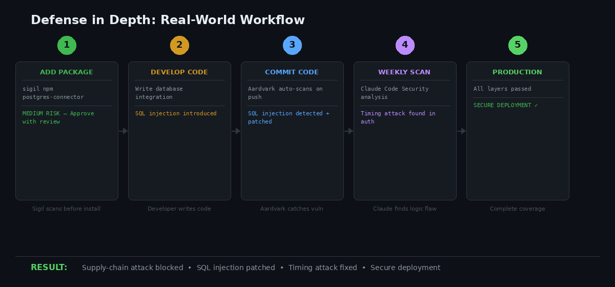 Result: Complete coverage across the entire development lifecycle. Layer 1 prevented a malicious package from executing. Layer 2a caught an SQL injection in the developer's own code. Layer 2b found a timing attack that both manual review and pattern matching would likely miss.