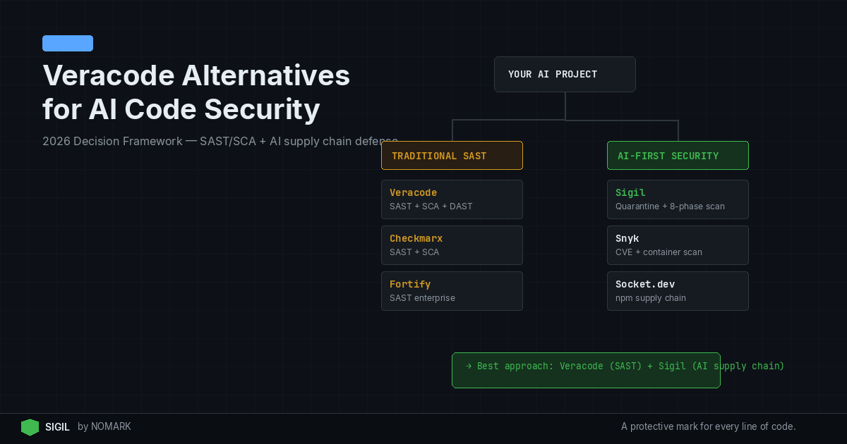 Veracode is a mature enterprise application security platform focused on SAST, DAST, and SCA, but it does not natively quarantine or behaviorally analyze AI agent code, MCP servers, or package install hooks before execution. In 2026, teams typically pair or replace Veracode with tools like Sigil that add fast, pre-execution, behavior-based scanning to stop obfuscated payloads, data exfiltration, and hidden install hooks that CVE-only scanners miss.